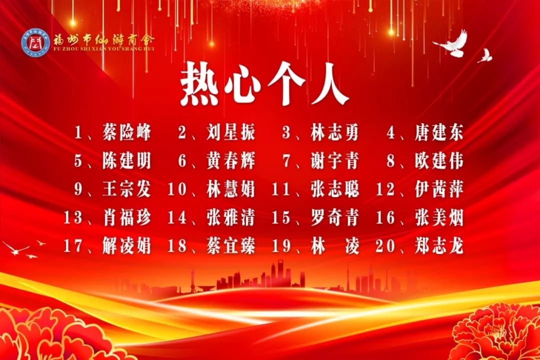 楊鋒監(jiān)事長;羅文棟執(zhí)行會長;唐麗芹常務副會長兼秘書長;常務副會長邱清毓、林承東、張懷玉;鄭瑞椿主任向20名商會熱心個人頒獎