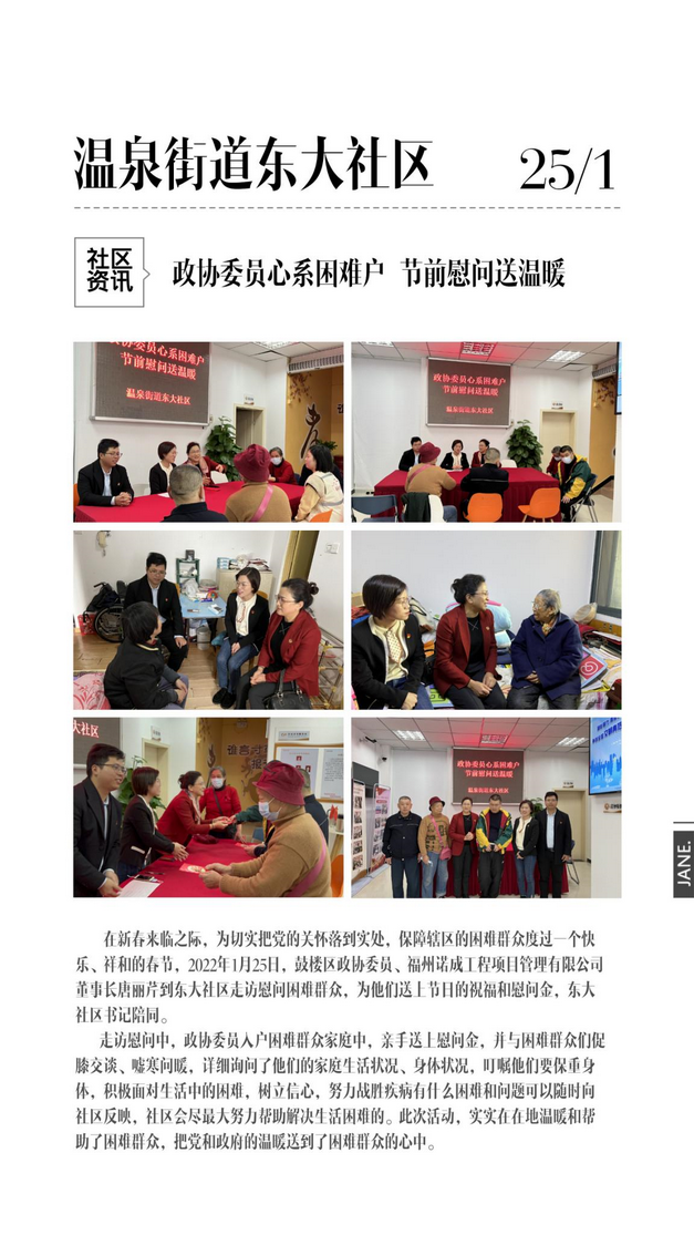 年終歲尾,春節(jié)將至,最是情深歲寒時(shí)。2022年1月25日上午,福州諾成工程項(xiàng)目管理有限公司董事長(zhǎng)唐麗芹,群工委員、項(xiàng)目管理部副經(jīng)理吳閩廷,黨辦主任曹欽銘,調(diào)度中心高擁民開(kāi)展2022年新春慰問(wèn)系列活動(dòng)。聯(lián)合結(jié)對(duì)溫泉街道東大社區(qū)慰問(wèn)五戶(hù)貧困戶(hù),送溫暖;慰問(wèn)公司困難職工林風(fēng)貴,情暖人心。