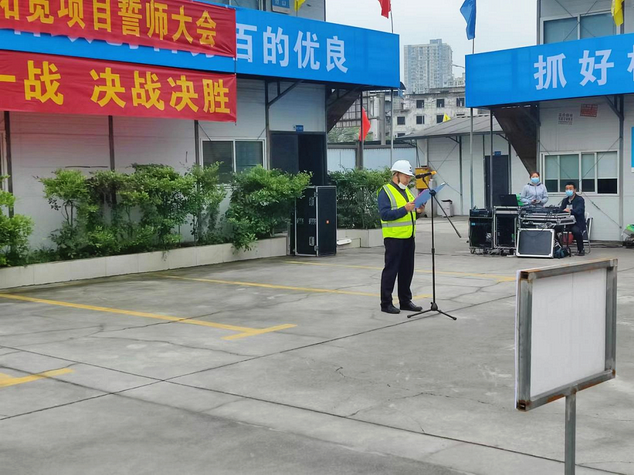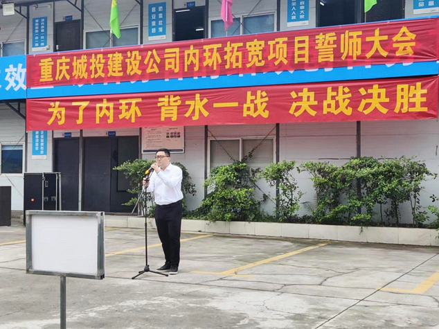 決戰(zhàn)決勝誓師大會(huì)現(xiàn)場(chǎng),重慶城投建設(shè)公司黨委委員、副總經(jīng)理?xiàng)钴姶砉緸閮?nèi)環(huán)攻堅(jiān)突擊隊(duì)授旗。全體突擊隊(duì)員在宣誓中表示將“為了內(nèi)環(huán)、背水一戰(zhàn)、決戰(zhàn)決勝”,取得攻堅(jiān)戰(zhàn)的全面勝利,確保項(xiàng)目于今年年底前完成內(nèi)環(huán)主線通車任務(wù)。